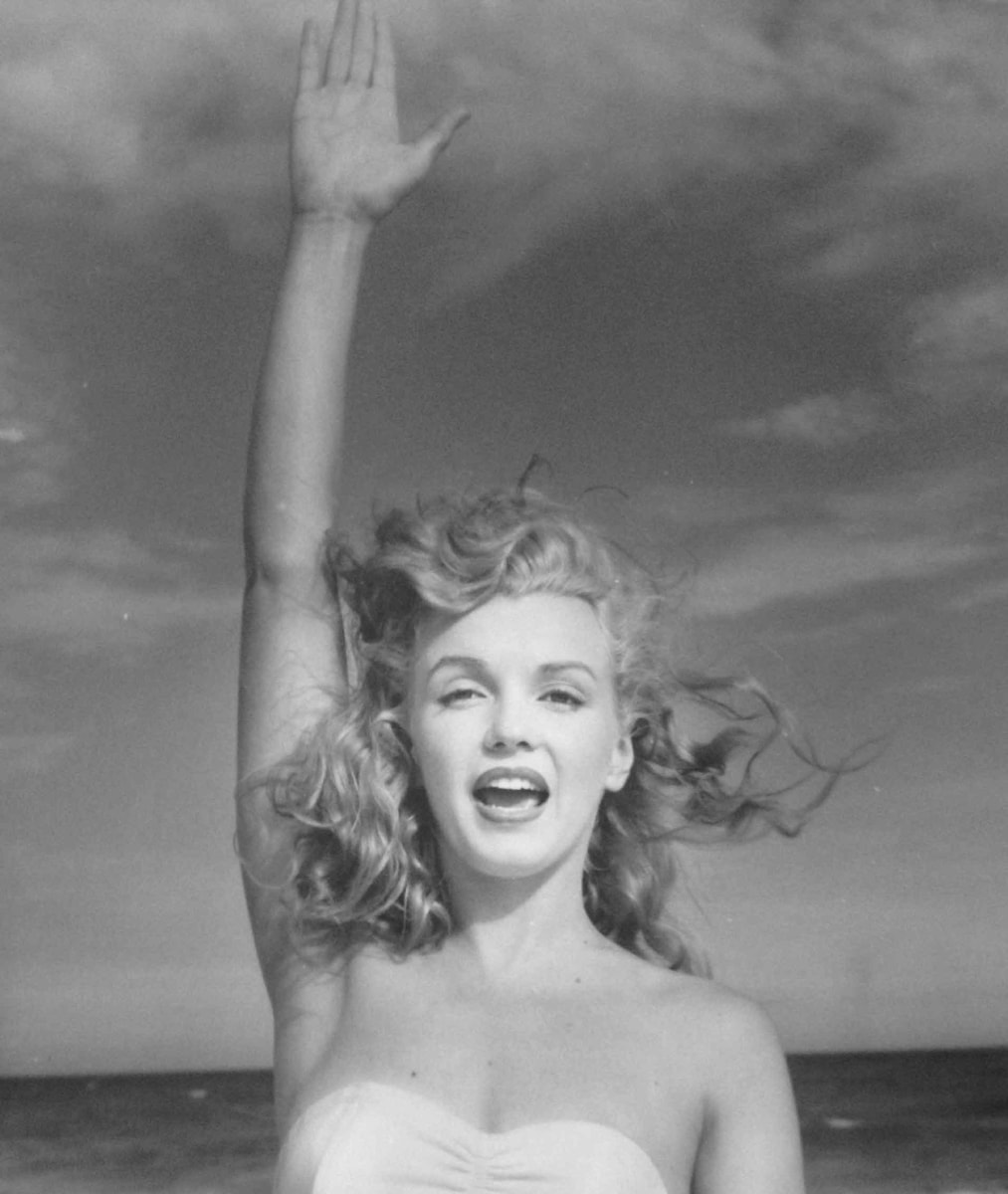 In 1949, while in New York on a publicity tour for “Love Happy”, Marilyn called de Dienes. She said “Andre, Let’s take pictures again! Let’s make history!” After buying her two swimsuits and two parasols, he drove her to the isolated Tobay Beach in Long Island. In these photographs, Marilyn adores the camera almost as much as it adores her. Scampering confidently and joyfully on the beach, hair golden, skin luminous, body ripened, she is on the brink of stardom and feels it. These photographs show her startling transformation from shy Norma Jeane into sex kitten Marilyn. In 1949 or 1950, the aspiring actress overheard someone at a party call her a “chinless wonder”, she secretly went under the knife, postponing a screen test claiming that she had fallen on her chin. When she finally took the screen test, the director said “Honey, you should have cut your chin two years ago.” It is unknown whether these photos were taken before or after her surgery.