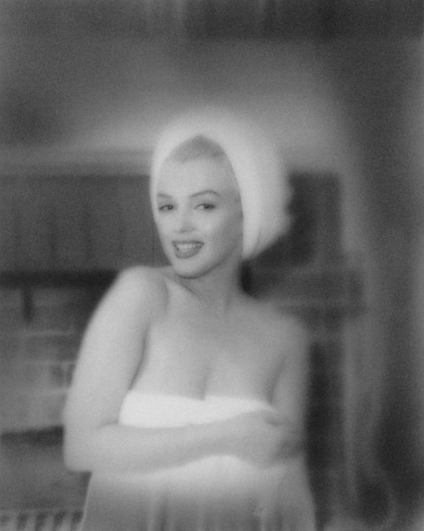 In 1950, de Dienes moved permanently to Hollywood and he and Marilyn forged a very successful working relationship. In 1952, de Dienes was assigned to photograph her for Pageant magazine. The now world-renown star sent her team away from her Bel Air Hotel bungalow to be alone with de Dienes. She posed for him suggestively wrapped in a towel and taking a bubble bath, playing every bit the “Blonde Heat”, but he also photographed her casually reading scripts in bed, exercising and going about her daily life. These photographs express their intimate friendship and her trust in him as a photographer and confidante.