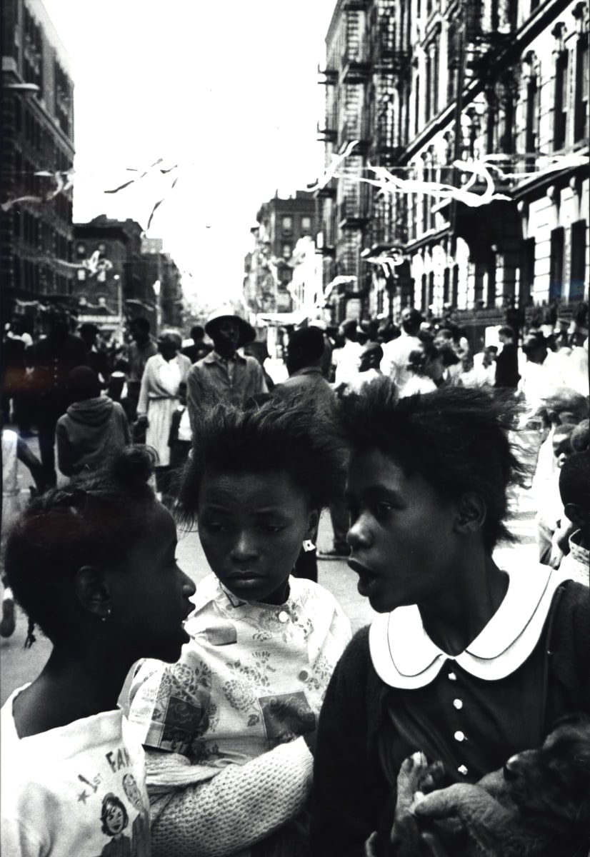 Three Girls Talking with Large Crowd Behind Them in the Street, Harlem, New York, 1963