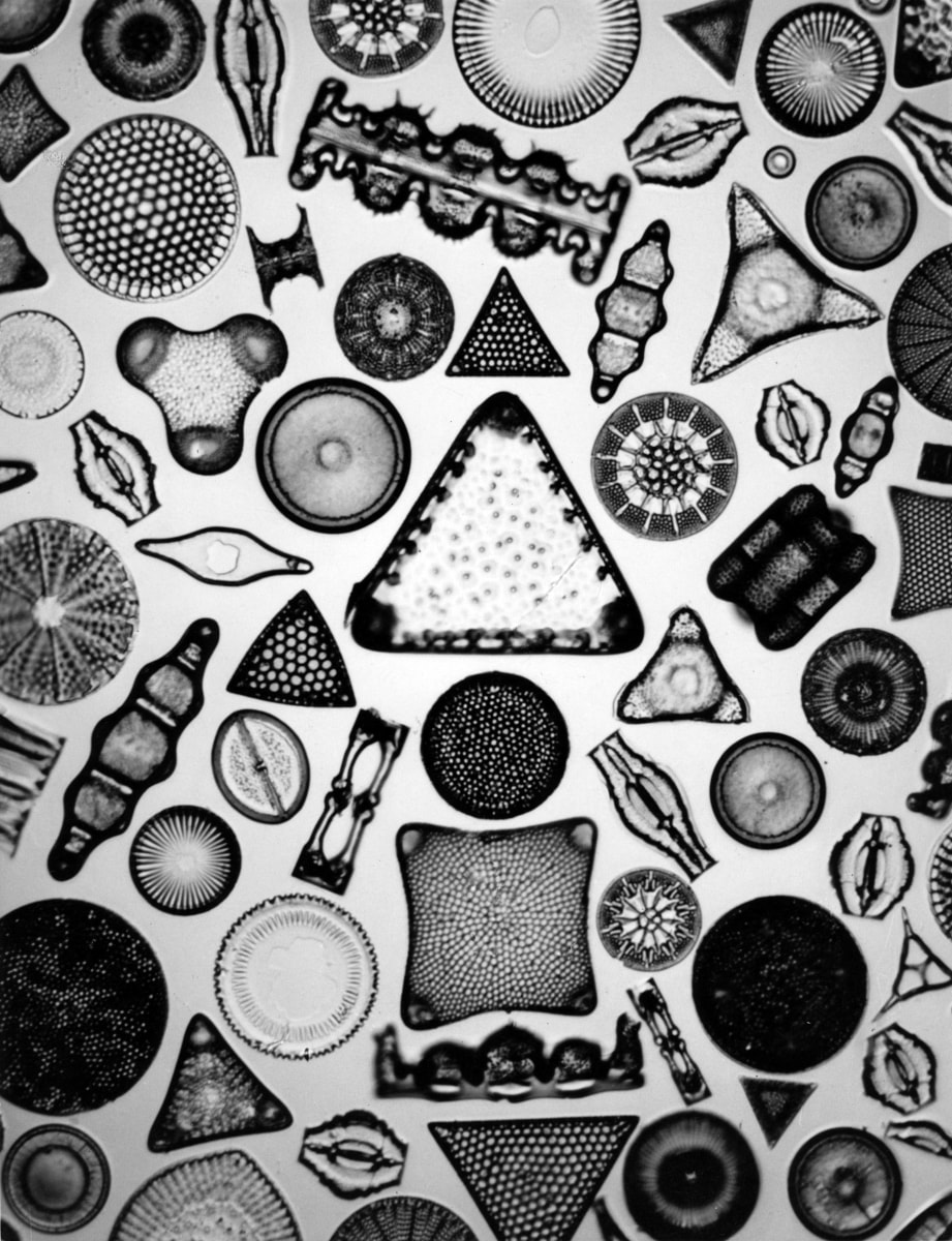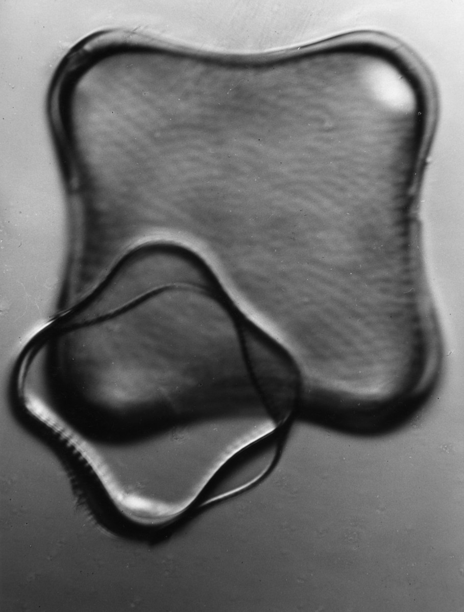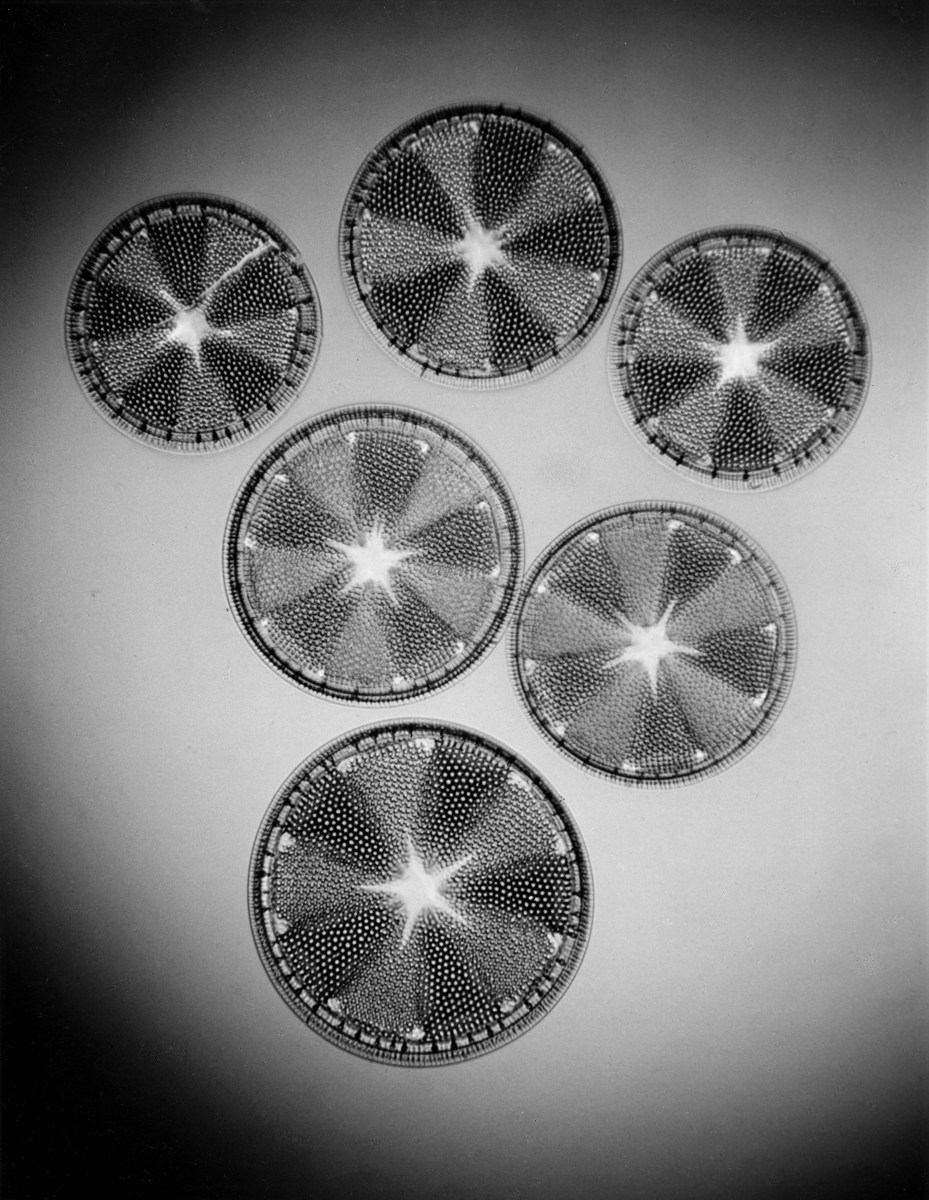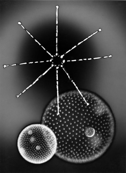 Carl Strüwe did not present microphotography as scientific evidence. Rather than using the usual circular image produced by the microscope he innovated a rectangular lens frame based on the standard Western format for painting and drawing. Strüwe’s photographs emphasized the basic geometric structures of microscopic organic life. He portrayed the microcosm as an abstract world similar to the images of Cubism and Constructivism.