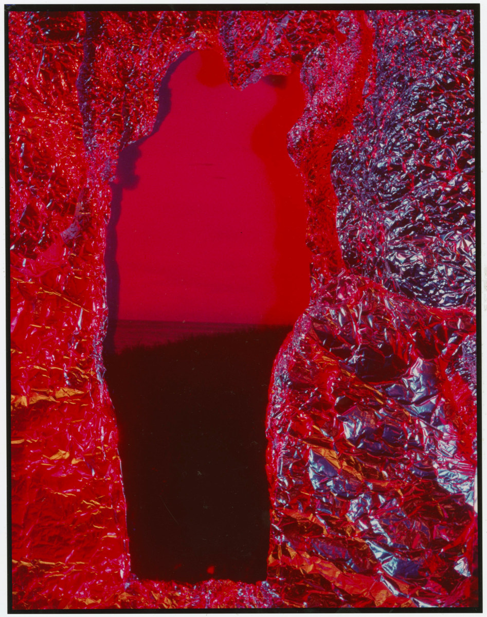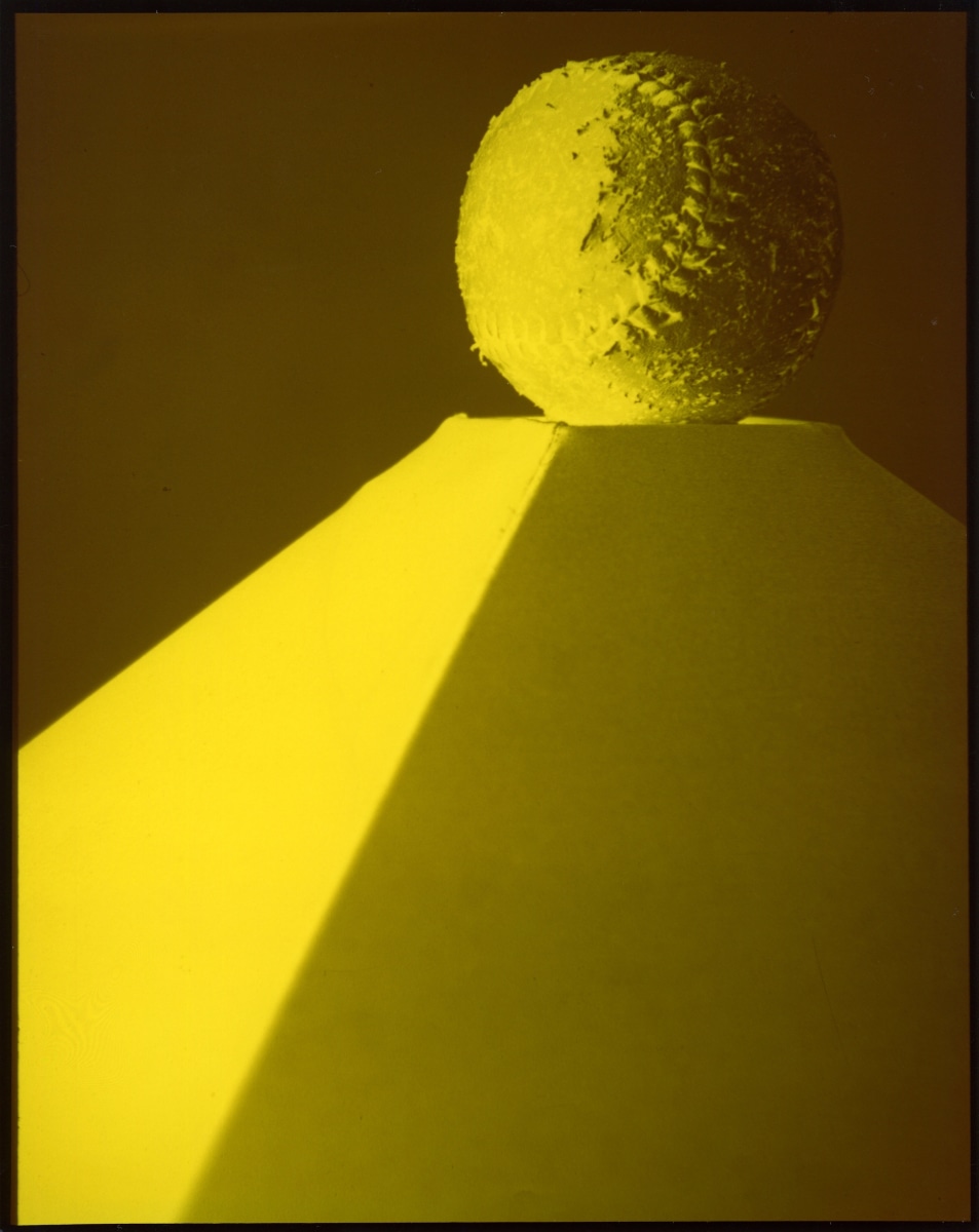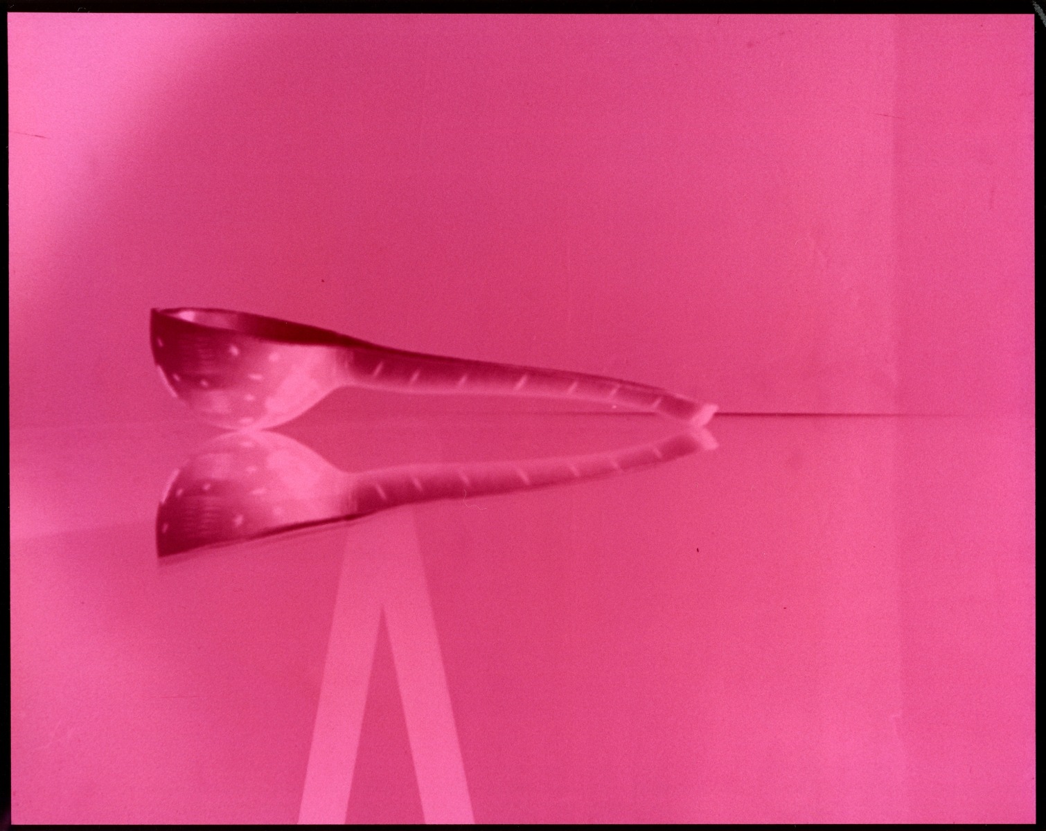 DeSana made these images after contracting AIDS and suffering a spleen removal operation. In many of these images the human body, DeSana’s most enduring subject, is conspicuously absent. Faced with his own mortality, DeSana began to focus on studio props rather than people interacting with them. He eschewed working with models and focused on experimenting privately with processes of collage, photographing through transparent surfaces, and self-portraiture. His signature gel-covered tungsten lights remain. Stripped of their context, objects associated with suburbia and sex, such as a spoon, a baseball, shaving cream and aluminum foil come to embody feelings about primal beginnings and ends. He addresses this idea directly in a 1990 interview with Laurie Simmons: