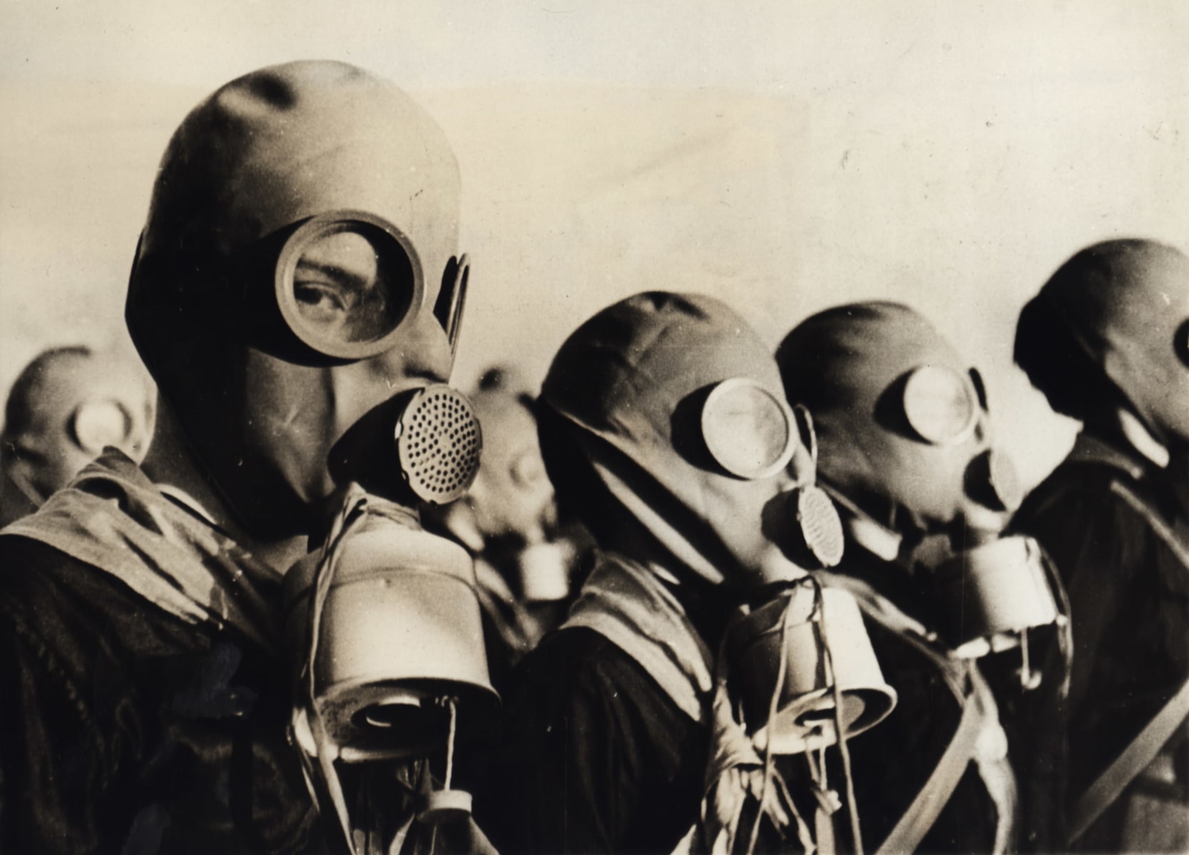 Their faces covered with gas masks, these youngsters, members of the "Sons of the Wolf" Division of the Fascist Youth Organization, are ready to march in a parade. The boys range in age from eight to 14, January 23, 1941