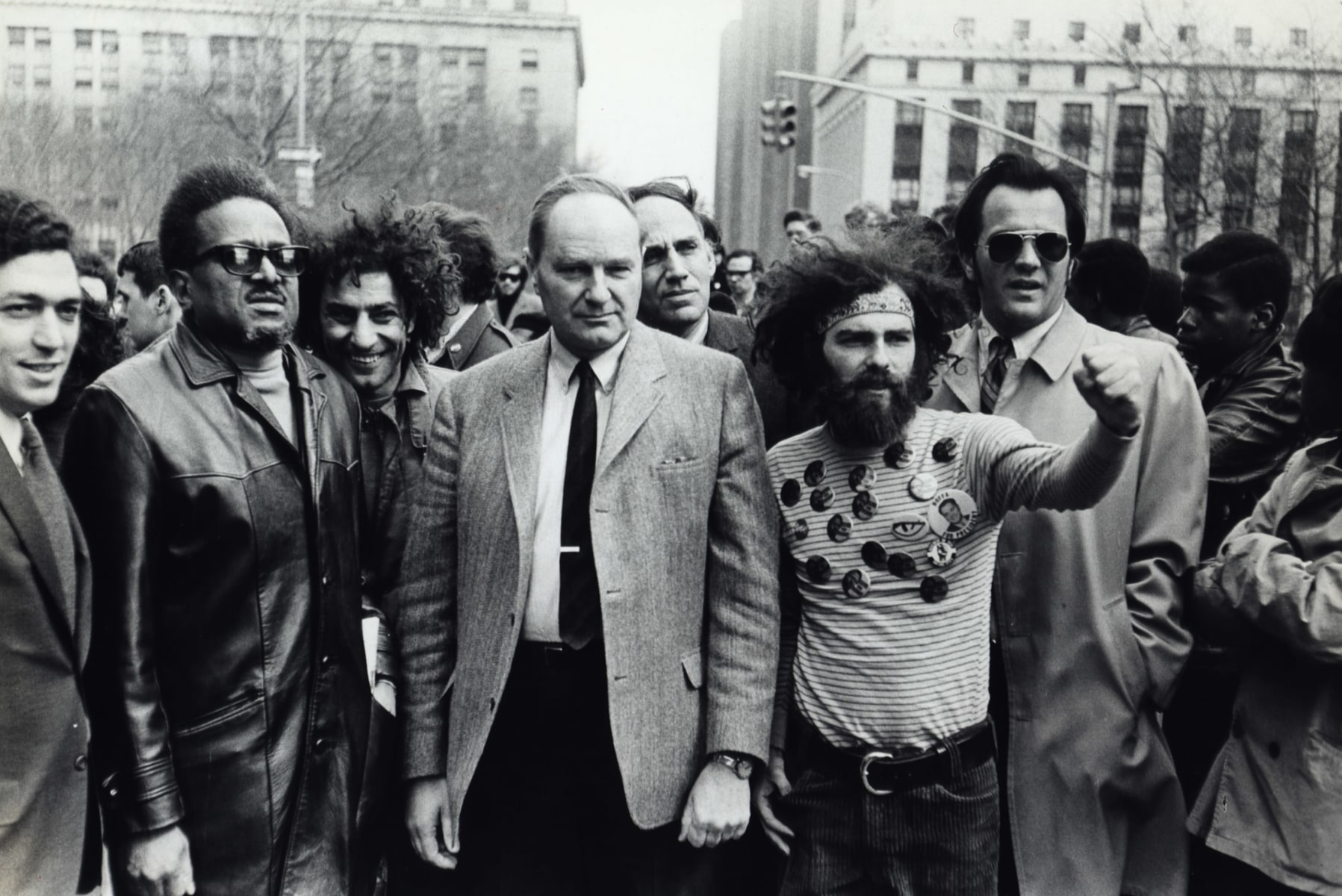 Gerald Lefcourt, David Brothers, Abbie Hofmann, Dave Dellinger, William Kunstler, Jerry Rubin, and Arthur Turco at rally, June 22, 1969