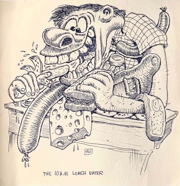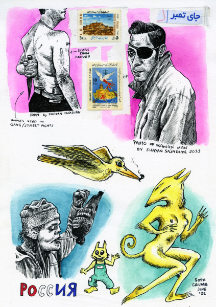 Ink, pen, markers, pencil, watercolor, collage on paper