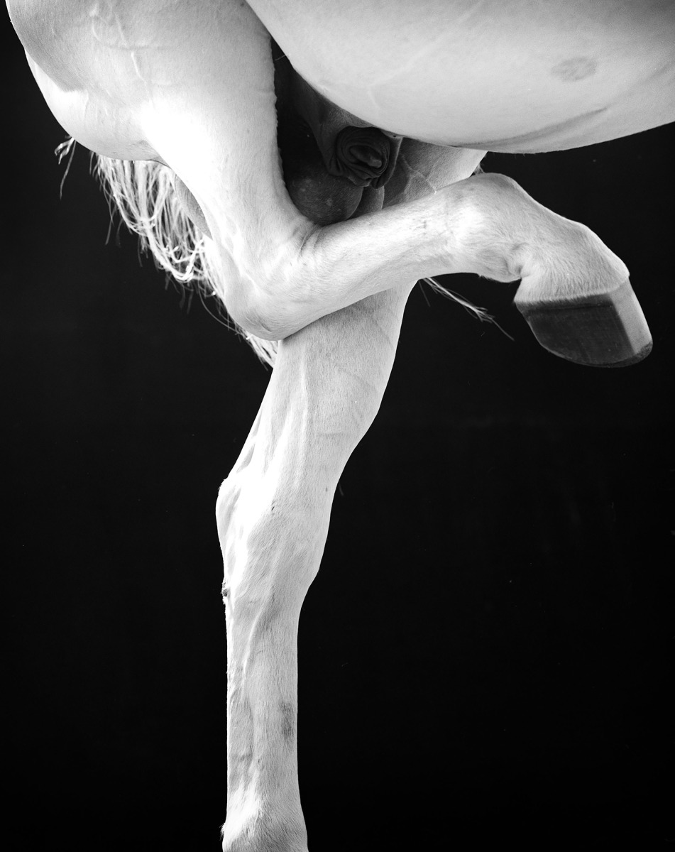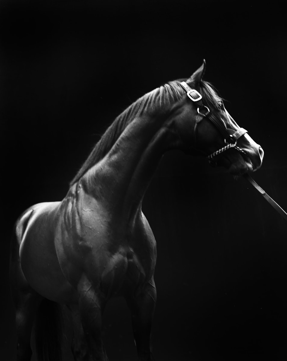 Latham spent months photographing at premier race courses and horse farms, roaming the stables, seeking to comprehend the special pride and dominant air that the thoroughbreds embody. Latham experimented with various cameras and films, with lighting and exposure, and with large-scale sets to achieve his creative vision. He decided to use only natural lighting, creating a further set of technical challenges, and chose to shoot on film with medium and large-format cameras. “To portray true essence, the image has to be truthful, I used film because it can’t be manipulated like digital photography. Film also gives a softness and subtlety that enhanced the emotional connection.”